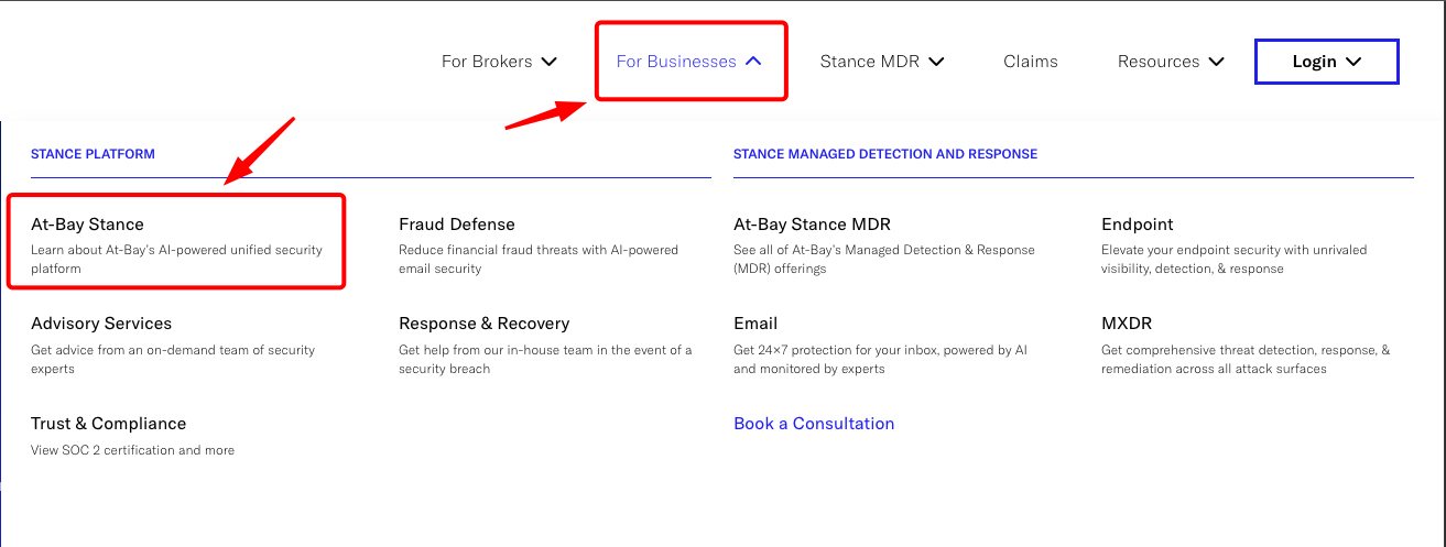 Hover over For Businesses in the top navigation bar, then select At-Bay Stance from under the Stance Platform section.